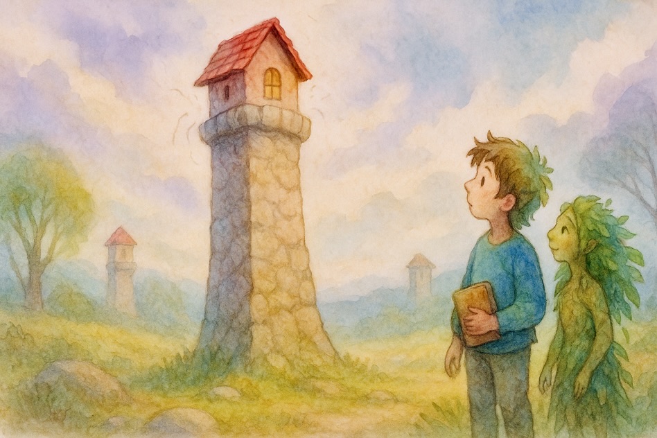 Through the windows, Nimbin saw the countryside roll by. Stone towers moved across the landscape, each with its little house swaying on top.