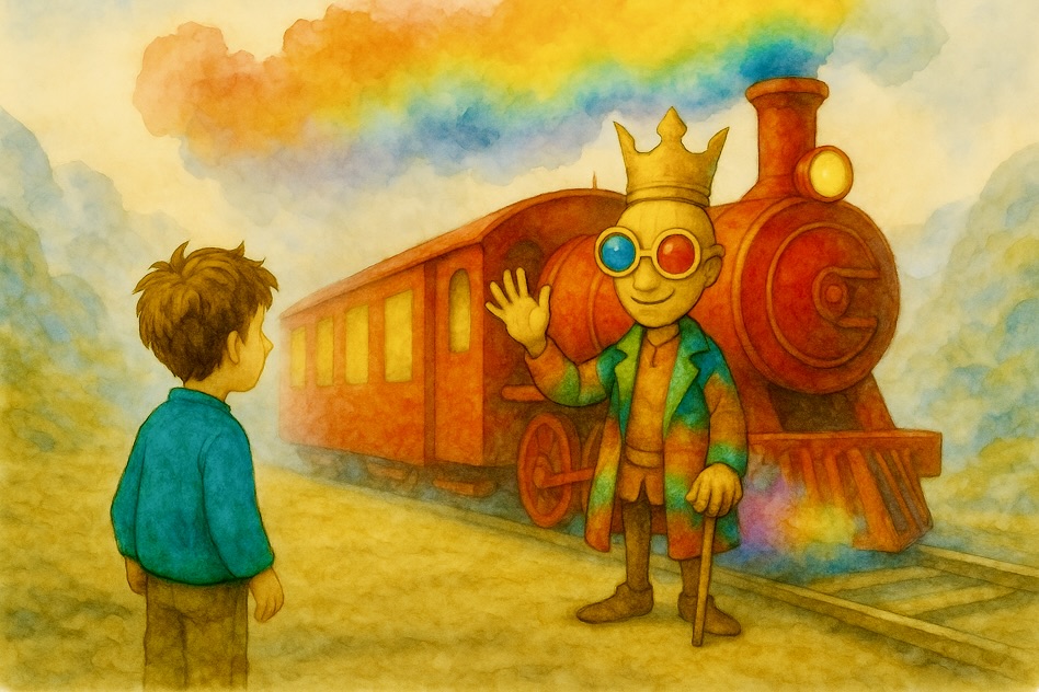 As Nimbin leaned closer, the miniature world began to grow around him. Before he realized it, he stood on a train platform.