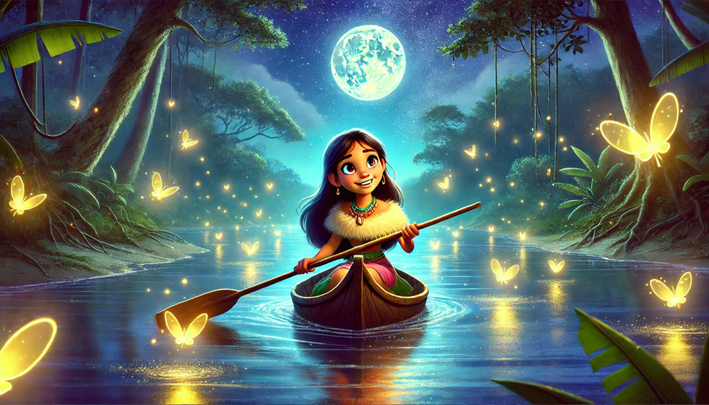 She gathered two logs and climbed into her canoe. Guided by shimmering fireflies, she glided across the water, their light reflecting on the river’s surface.