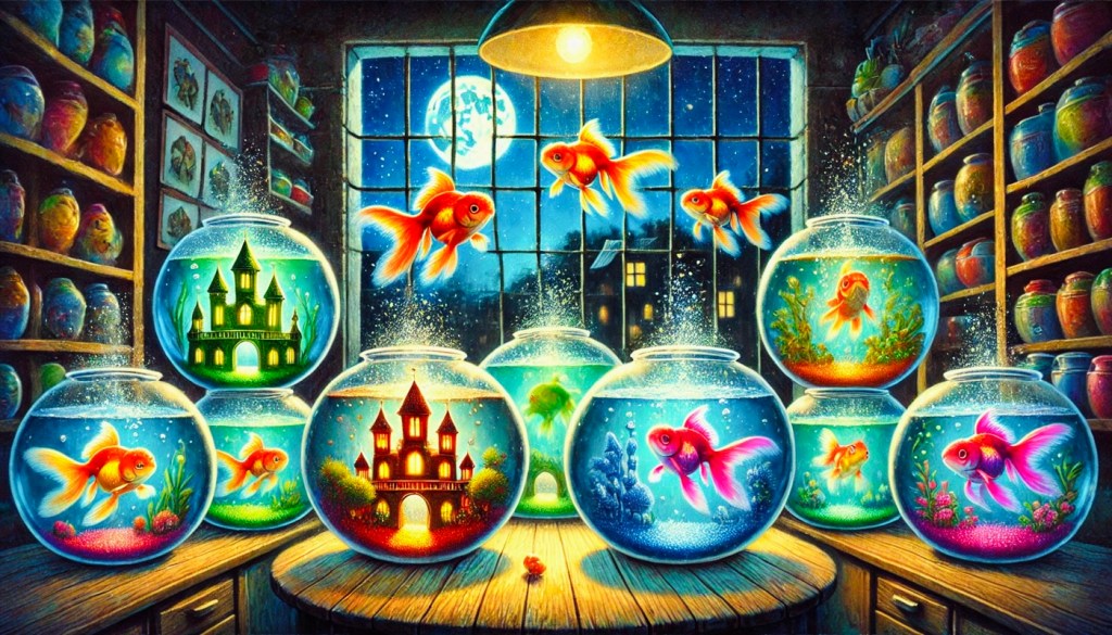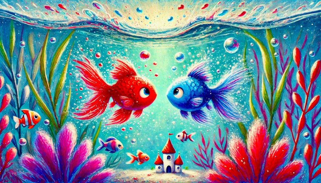 That night, Red and Blue jumped between fishbowls. Orange, green, and yellow fish in separate little worlds. They swam through the plants and laughed at every difference.