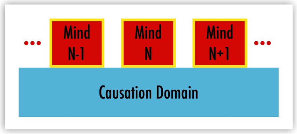 Each mind engages with the Blue Space while creating and maintaining its own Red Space, producing an individual meaning while interacting with a shared causal world.