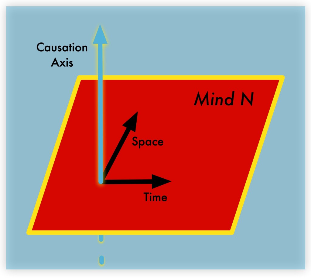 The blindfold restricts us to Red Space. We can’t see the causation axis operating in the Blue Space. We measure participation using time and map relationships using space. Because the underlying causation remains hidden from view, we attribute causal power to our measurements themselves. Time appears to drive change when it’s simply our tool for making sense of change we can’t observe.