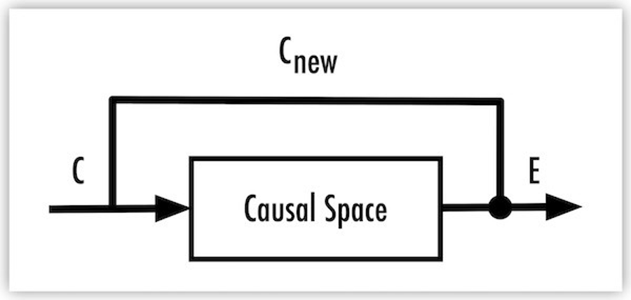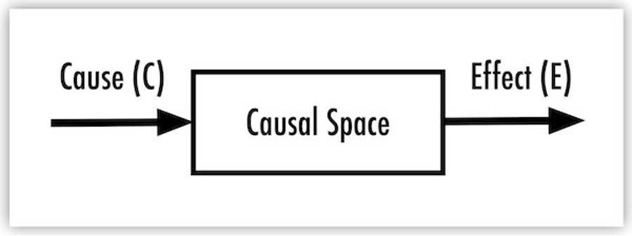 In the diagram, cause (C) enters the causal space, where it is processed according to the space’s rules, resulting in an effect (E):