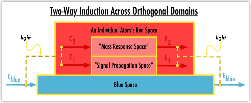 These internal interpretative effects (E1 and E2) then induce responses back in the Causation Domain through two-way induction. E1 induces the atom to output light that propagates causally to the next atom in the chain. E2 induces electron movement that propagates causally between atoms through the conductor.