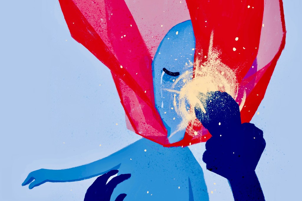 The Abstractionist lifts a piece of veil from the weeping puppet’s face, putting him to sleep.