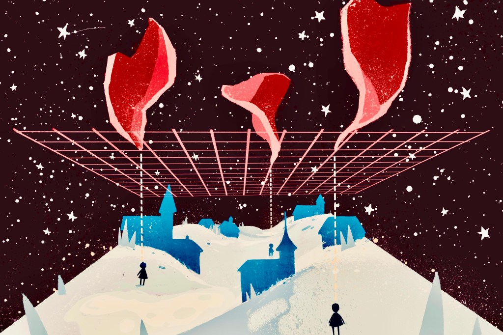 A translucent red veil covers the puppet’s head, waving in the air like a candle flame.