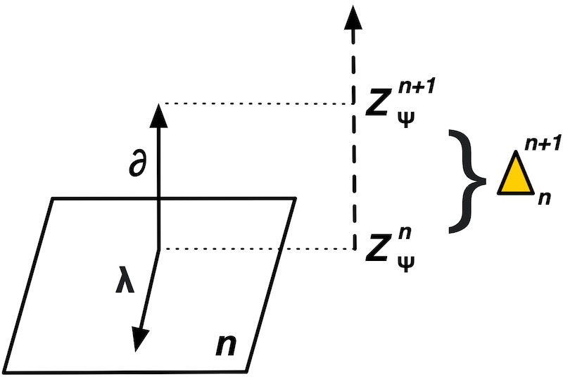 - In a first Natural Space (n-1) (a “blue space”), entities of a first type (“blue entities”) having Zn-1 interact with each other governed by Ψn-1;
