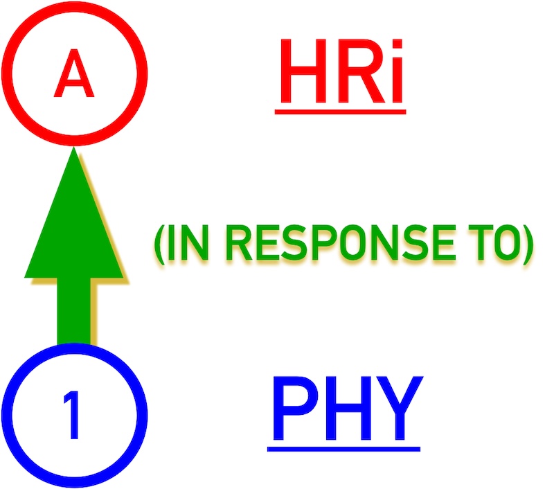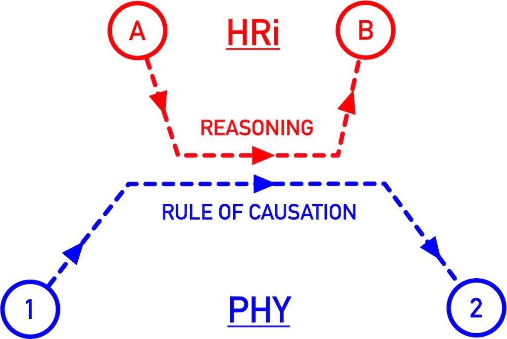 Regardless of what the underlying Rule may be, what links ➀ to ➁ in PHY (i.e., what we refer to as gravity) is not the same thing that operates on Ⓐ or Ⓑ in HRi.
