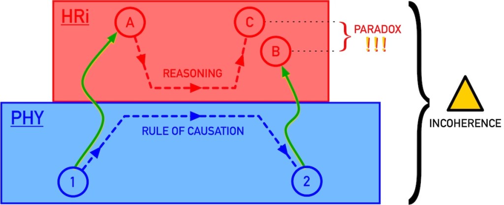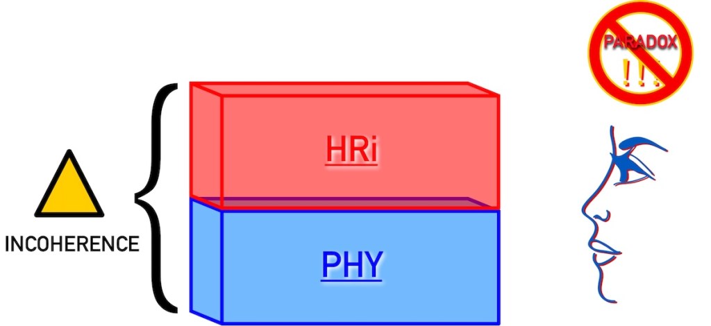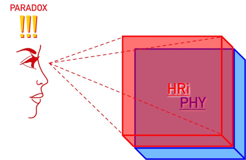 If Thira holds an inside-out perspective such that, to her, HRi and PHY are commingled, the irreconcilable conflict between expectations Ⓒ and observations Ⓑ gives rise to a paradox: