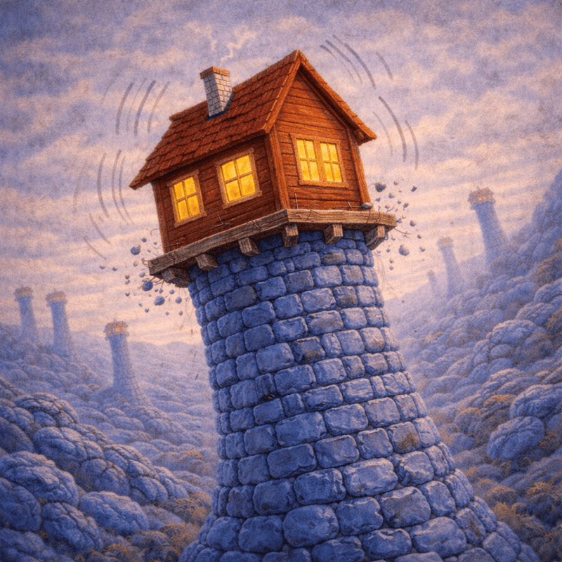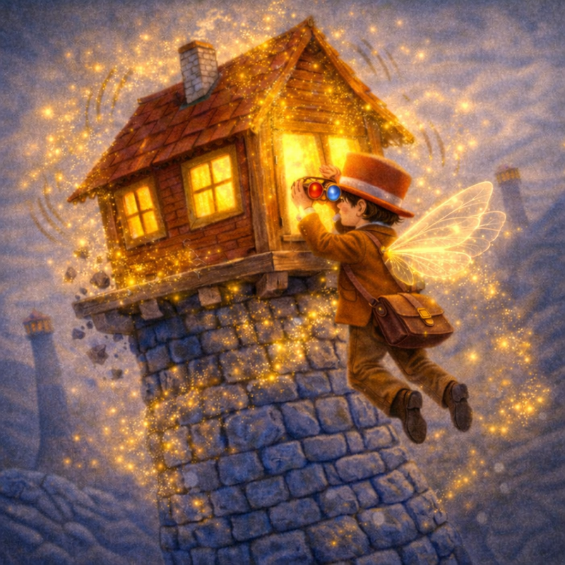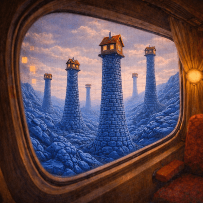 By evening, blue stone towers dotted the hills, each with a red house swaying on top.